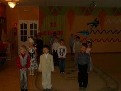 18 февраля состоялся утренник, посвященный Дню защитников Отечества. В празднике приняли участие дети подготовительной группы № 8. Они с удовольствием пели песни: "Наша армия", Э. Ханка, "Песня пограничников" Н. Богословского, "Бравые солдаты" А. Филиппенко, исполнили русский танец "Яблочко" и активно участвовали в соревнованиях: "Кто меткий?", "Брось якорь!", "Боевая тревога!".