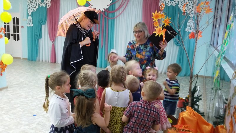 Целую неделю, с 12 по 16 октября, в музыкальном зале детского сада звучали песни и стихи об осени. В гости к ребятам пришли сказочные герои, лесные зверюшки. Золотая Осень прощалась с дошкольниками до следующего года.