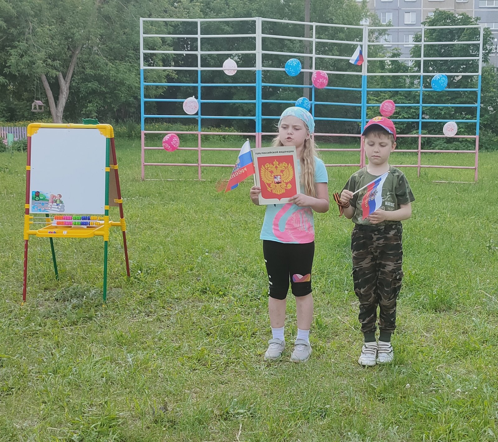 В этот день в детском саду звучали стихи и песни, посвященные нашей Родине. Ребята узнали, что у нашей страны есть флаг, герб и гимн. Не обошлось и без сюрприза. В гости к ребятам пожаловала Матрешка- традиционная русская игрушка. Она пригласила малышей на веселую игру, станцевала танец . Ребята старшей группы приготовили коллаж «Наша Родина-Россия».