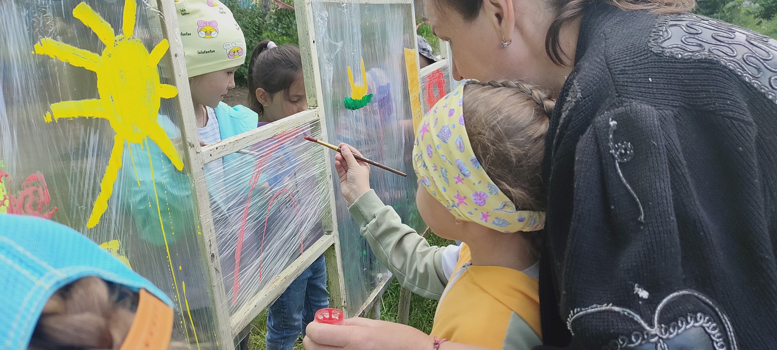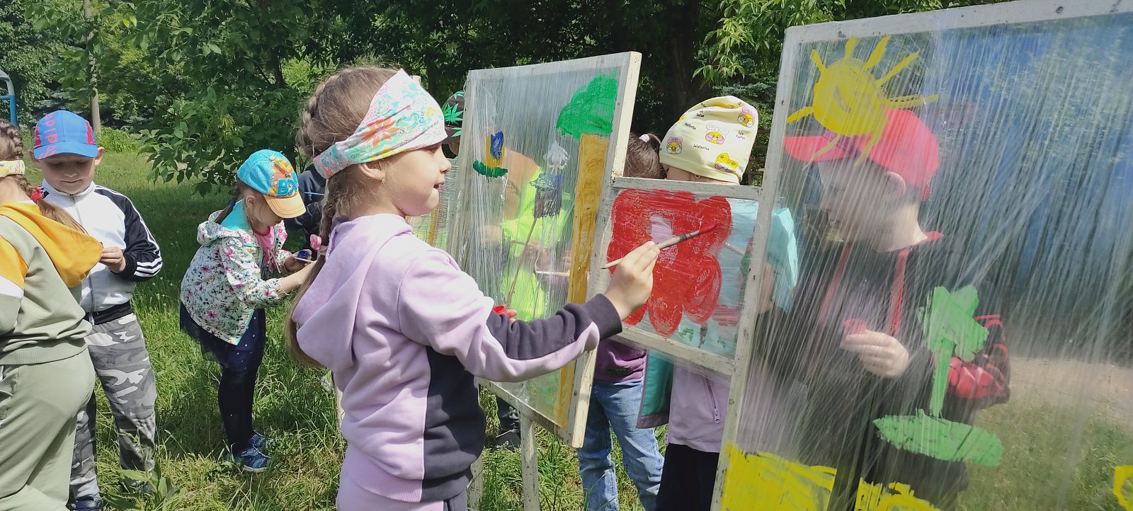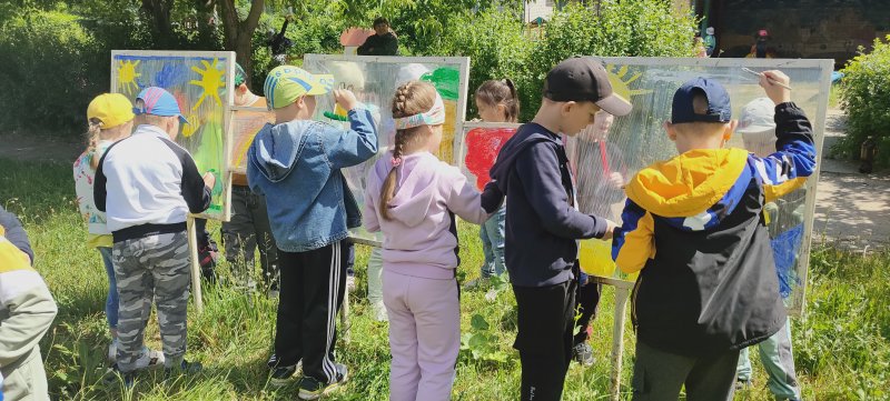 Ребята из подготовительной к школе группы приняли участие в необычном занятии-рисовании красками на пищевой пленке. Теперь территорию детского сада украшают настоящие картины, созданные юными художниками.