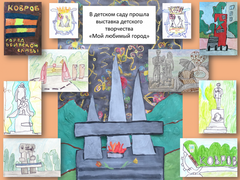 Отправиться в путешествие по городу Коврову можно, посетив выставку детского творчества в нашем детском саду. На рисунках легко можно узнать любимые многими места, памятники, здания.